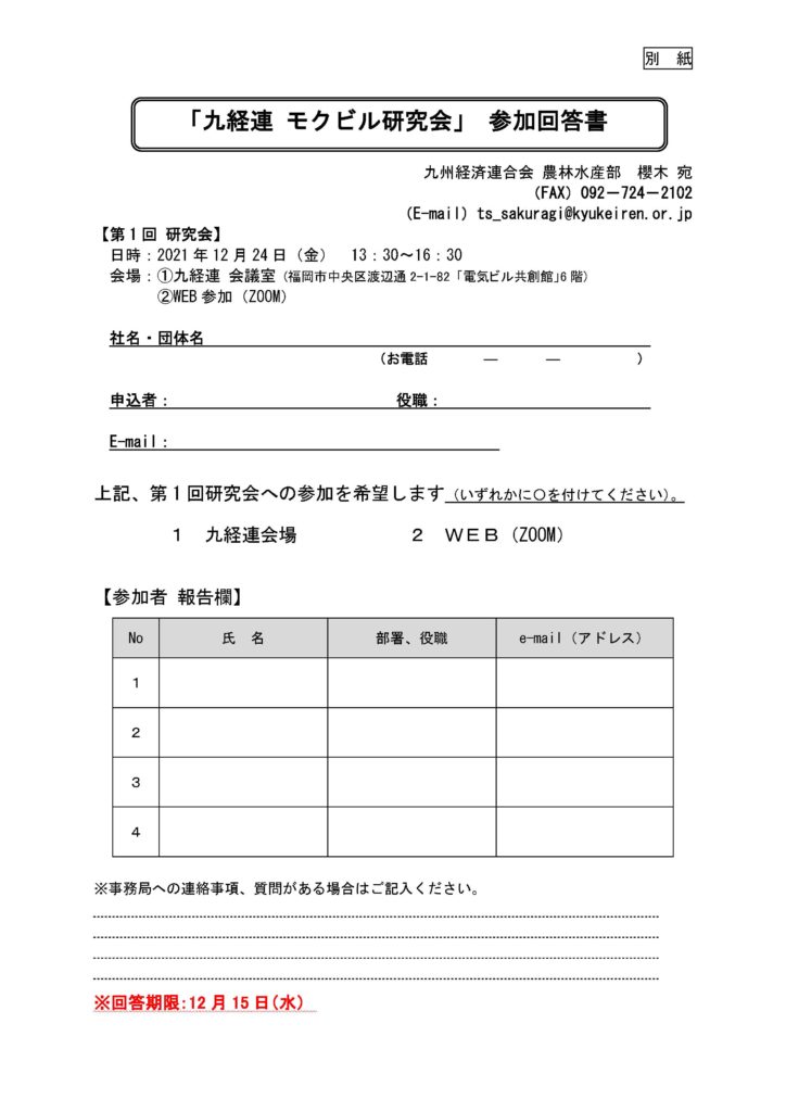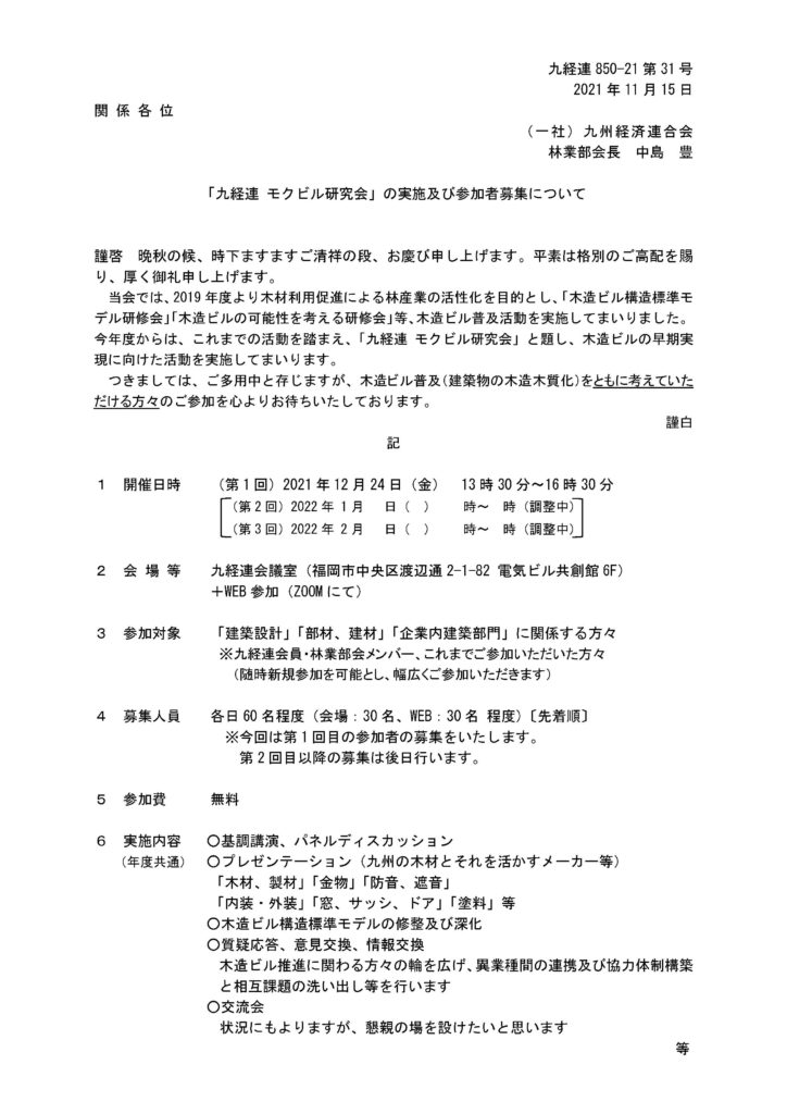 2021年11月17日 / 最終更新日 : 2021年11月17日 佐賀県建築士会 会員向け 「九経連 モクビル研究会」の実施及び参加者募集について 001【ご案内】九経連「モクビル研究会」第1回参加募集ダウンロード(PDF) 001【ご案内】九経連「モクビル研究会」第1回参加募集ダウンロード(Word)