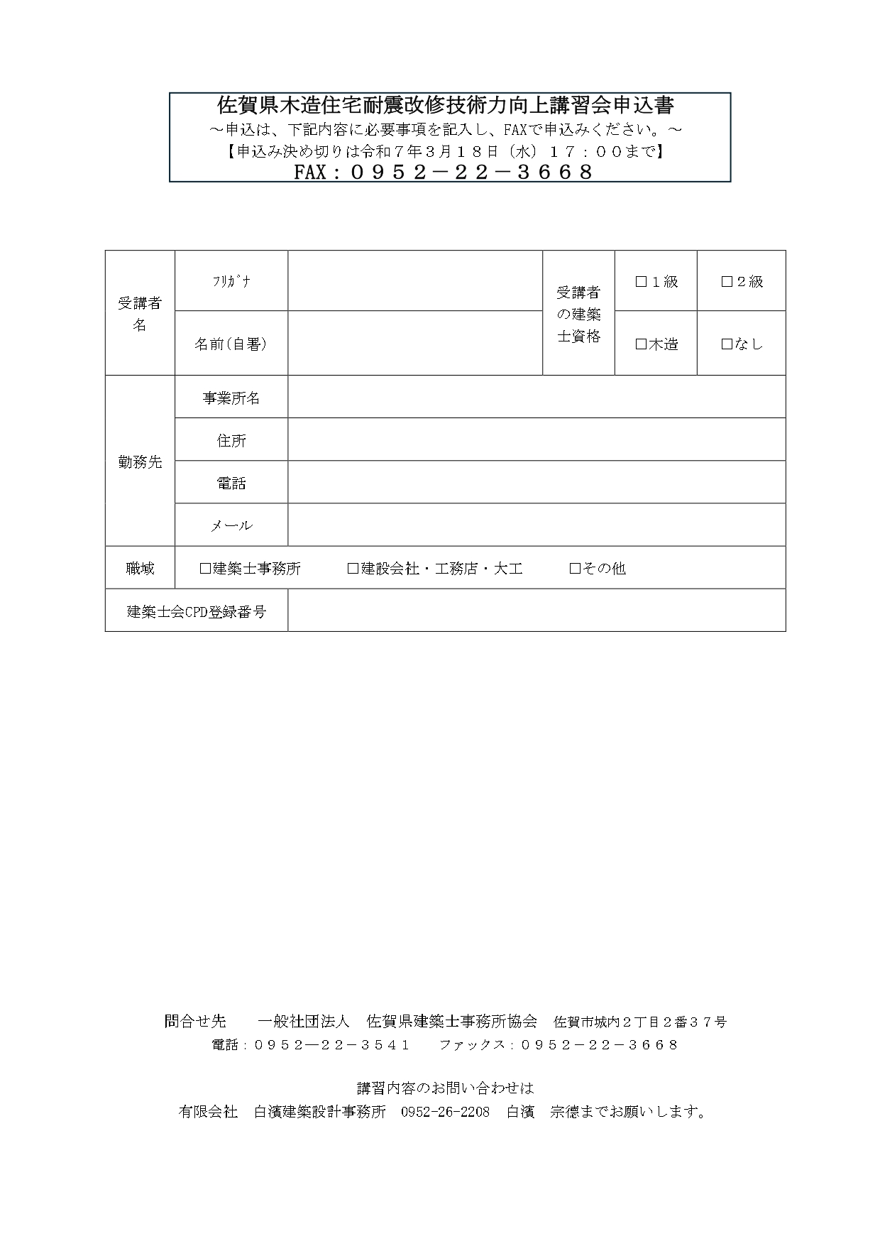 2026年2月12日 / 最終更新日 : 2026年2月12日 佐賀県建築士会 お知らせ 「令和7年度佐賀県木造住宅耐震改修技術力向上講習会」開催について 案内文 令和7年度佐賀県木造住宅耐震改修技術力向上講習会のご案内ダウンロード 申込書 令和7年度 佐賀県木造住宅耐震改修技術力向上講習会 (Word)ダウンロード 申込書 令和7年度 佐賀県木造住宅耐震改修技術力向上講習会 (PDF)ダウンロード