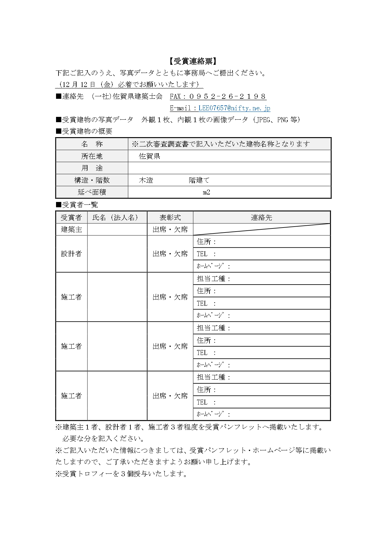 2025年11月27日 / 最終更新日 : 2025年11月27日 佐賀県建築士会 お知らせ 「佐賀の木・家、リニューアル、まちづくり賞」 受賞連絡票 「佐賀の木・家、リニューアル、まちづくり賞」 受賞連絡票 ダウンロードはこちら 受賞連絡票ダウンロード