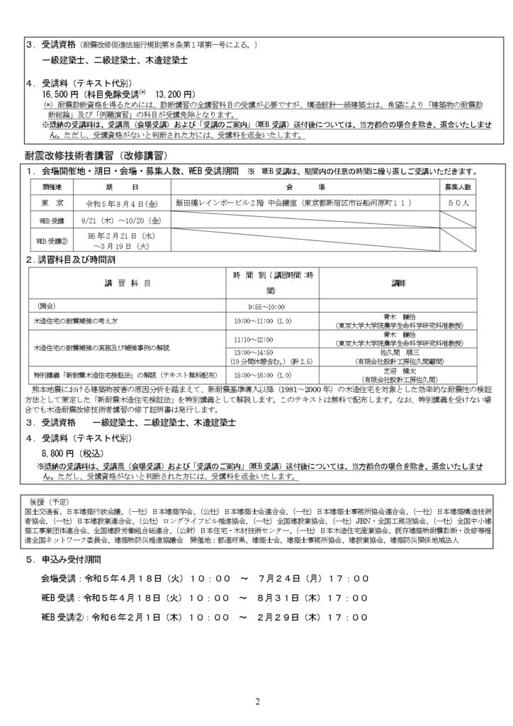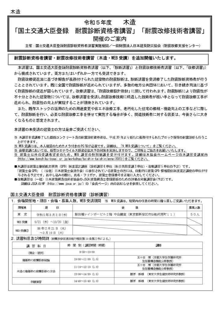耐震診断資格者講習・耐震改修技術者講習(木造・WEB 受講)を追加開催いたします。