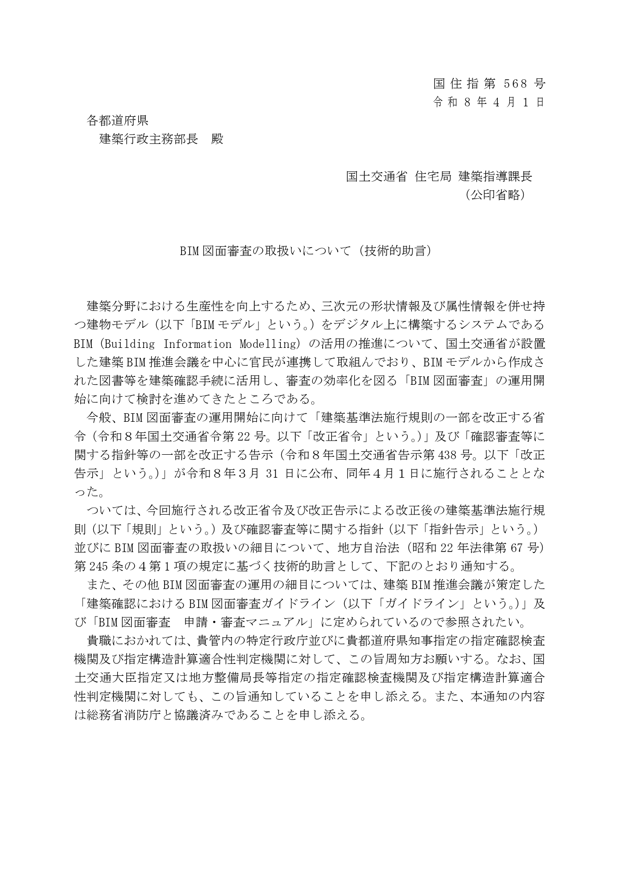 2026年4月3日 / 最終更新日 : 2026年4月3日 佐賀県建築士会 会員向け 【国交省周知依頼】「2026年4月 BIM図面審査開始」について 2026年4月 BIM図面審査が開始!ダウンロード 【都道府県宛て】BIM図面審査の取扱いについてダウンロード 官報ダウンロード
