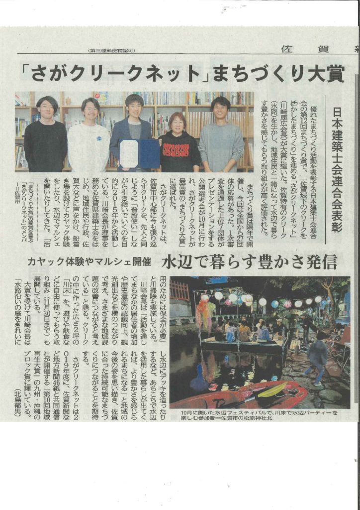 先月の全国大会しずおか大会に於いて日本建築士会連合会まちづくり賞審査会が開催され佐賀北地区の川﨑康広理事が取り組まれている「佐賀城下のクリークを活かしたまちづくり」がまちづくり大賞を受賞されました。