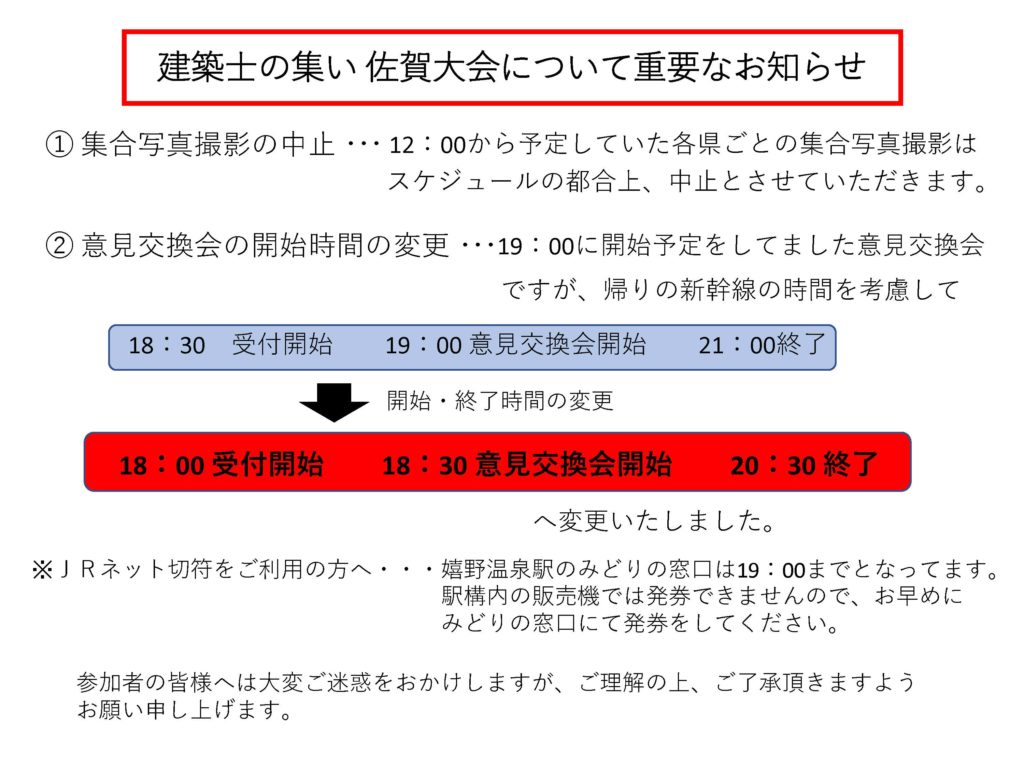 建築士の集い 佐賀大会について重要なお知らせ