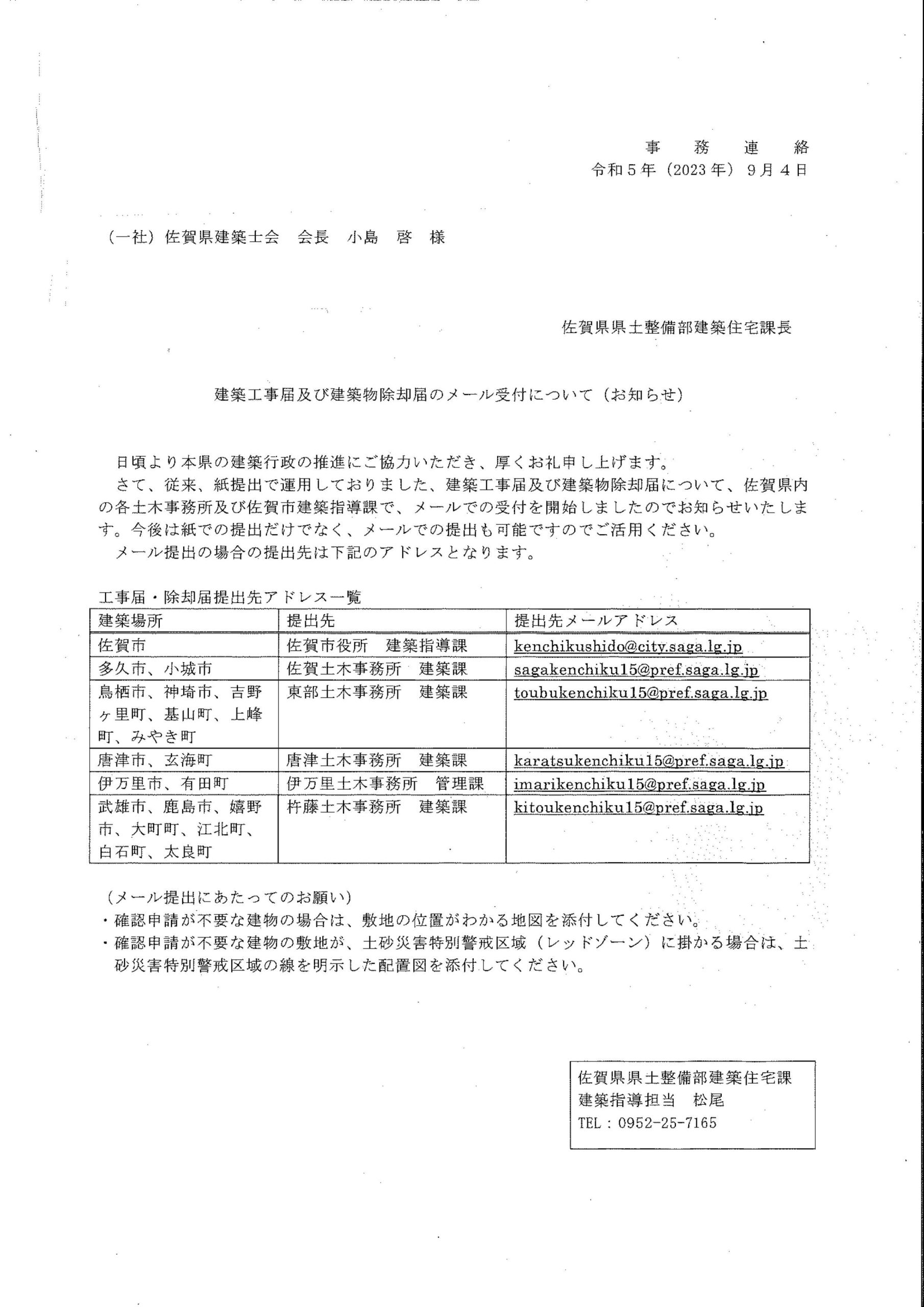 2023年9月14日 / 最終更新日 : 2023年9月20日 佐賀県建築士会 お知らせ 建築工事届及び建築物除去届のメール受付について(お知らせ) 建築工事届及び建築物除去届のメール受付について(お知らせ)