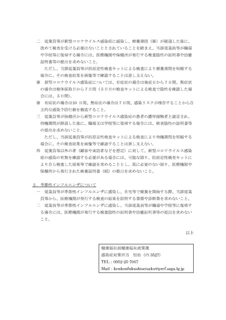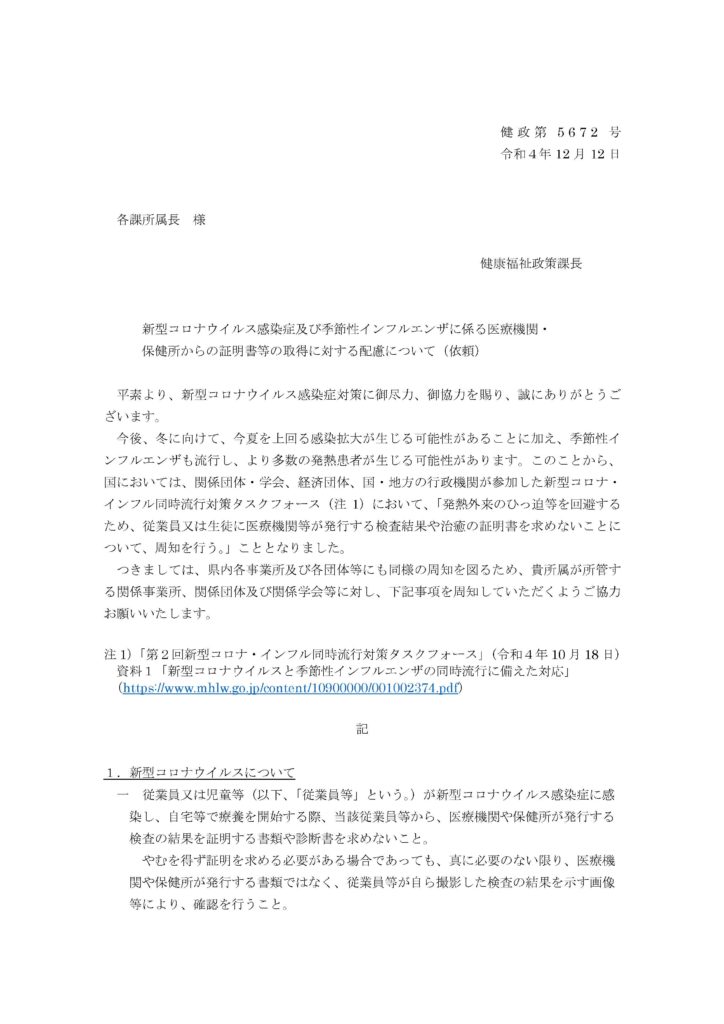 新型コロナウイルス感染症及び季節性インフルエンザに係る医療機関・ 保健所からの証明書等の取得に対する配慮について(依頼)