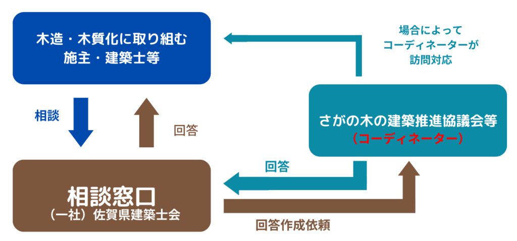また,窓口だけで解決できない相談に対しては,木造建築の設計や施工などの専門的な知識や経験を持つコーディネーターが訪問して相談対応を行います。